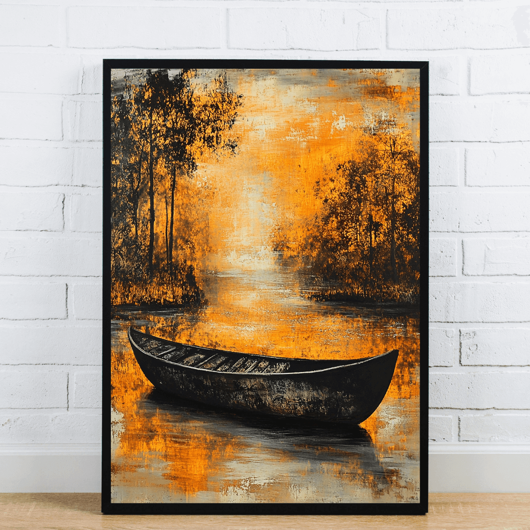 This striking abstract painting showcases a lone black canoe resting on calm water, with vivid orange and black tones creating a warm, reflective atmosphere. The surrounding trees add texture and depth, blending seamlessly into the fiery background. Perfect for adding a touch of nature-inspired art to any modern space.