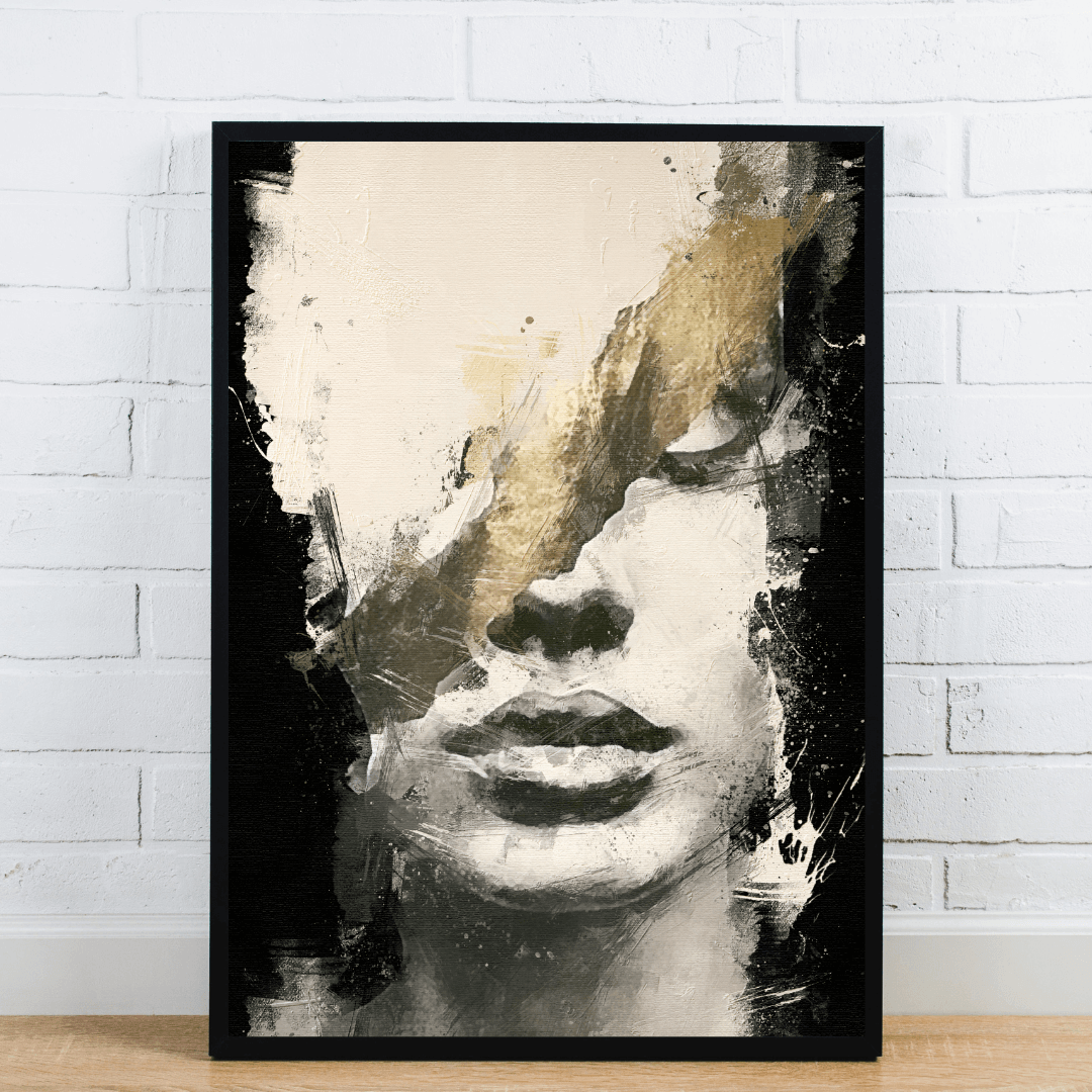 This expressive portrait blends a calm grayscale face with bold gold and black strokes that cut through the canvas. The textured detail and contrast evoke emotion and movement, making it ideal for living rooms, offices, or studios with a contemporary style.