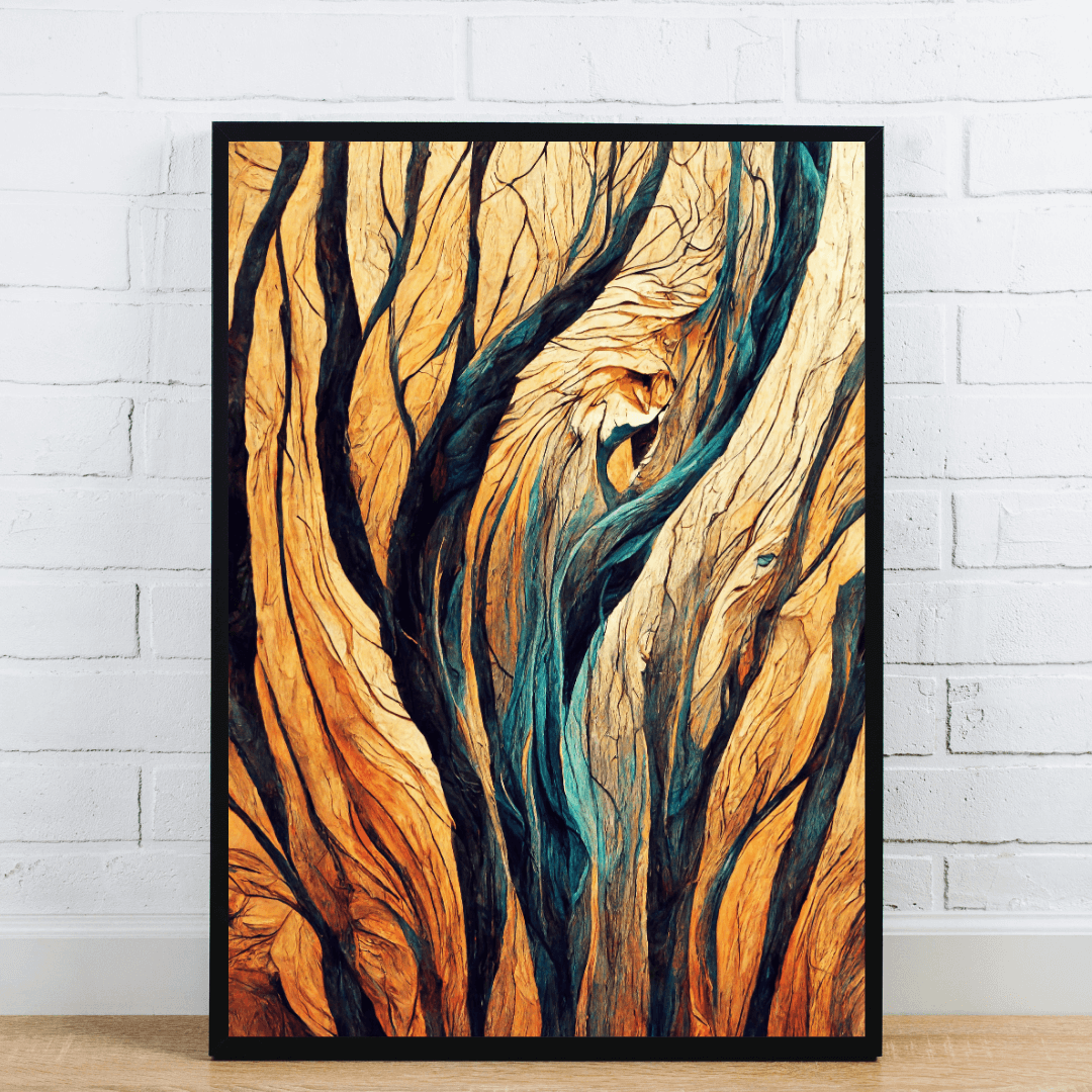 This captivating abstract wall art draws inspiration from the organic patterns of tree bark and natural wood textures. With flowing lines in vibrant golden yellows, deep browns, and striking teal highlights, the piece creates a sense of movement and depth. Ideal for nature lovers and modern art enthusiasts, this artwork adds warmth and energy to any interior—perfect for living rooms, offices, or creative spaces.