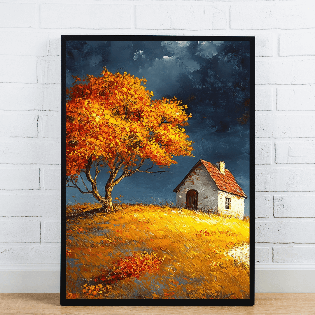 This eye-catching painting captures the peaceful beauty of fall. A small white cottage with a red roof rests quietly under a large tree ablaze with fiery orange and yellow leaves. The field is bathed in golden tones, while the deep blue stormy sky adds contrast and depth. The textured brushstrokes and bold color palette make this piece perfect for adding warmth and rustic charm to any space. Ideal for autumn lovers or countryside art collectors.