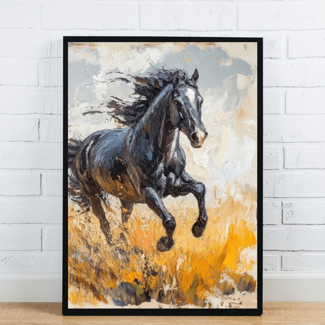 This dynamic art print captures the raw power and grace of a black stallion galloping through a field of golden grass. Perfect for equestrian lovers and those seeking bold, expressive wall decor, the painting blends modern brush techniques with a realistic subject, making it a striking focal point for any room.
