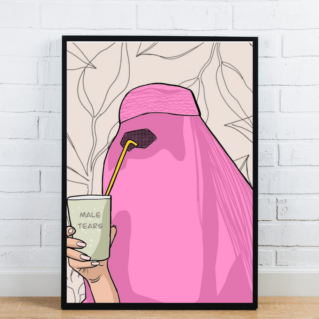 Contemporary feminist artwork of a woman in a pink burqa sipping from a “Male Tears” cup, combining satire and empowerment.