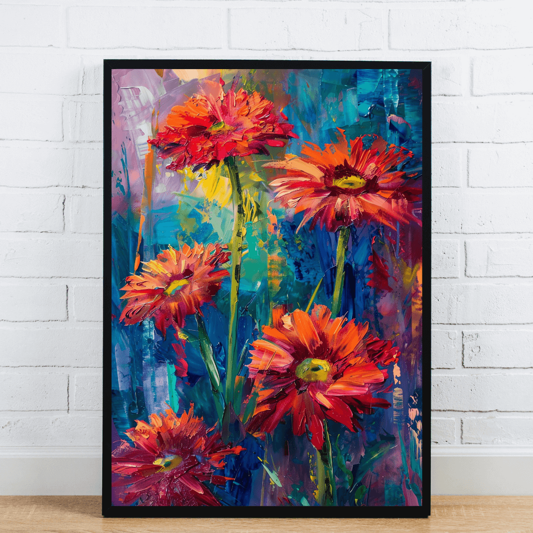 This stunning floral wall art showcases bold red and orange blooms bursting with life against an energetic abstract background of blues, purples, and yellows. The textured brushstrokes and vibrant palette evoke joy, energy, and natural beauty. Ideal for brightening up living rooms, bedrooms, or creative spaces, this piece is perfect for anyone who loves expressive, colorful nature-inspired artwork.