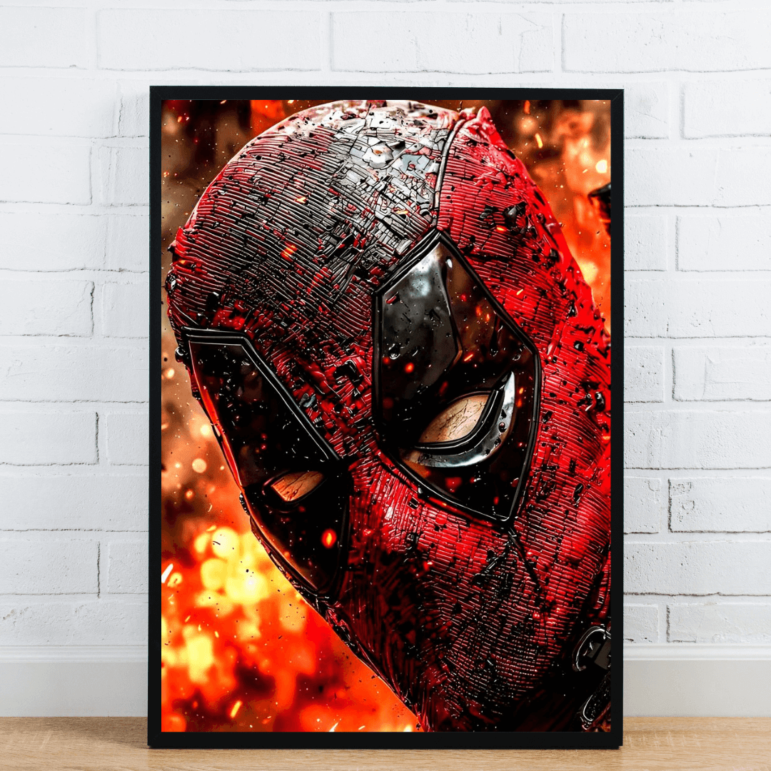Intense close-up artwork of Deadpool with fiery background and bold texture.