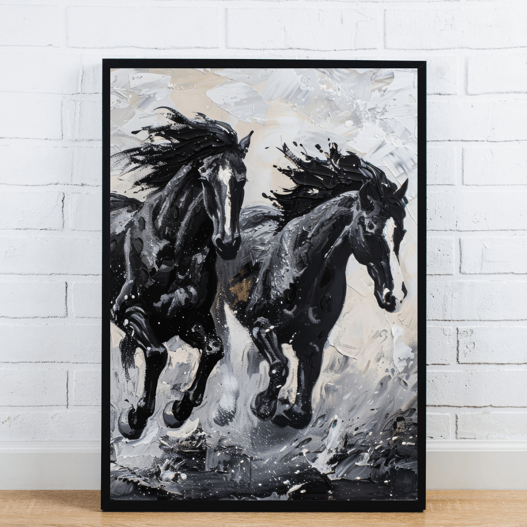 This striking wall art depicts two powerful black stallions galloping side by side, rendered in bold monochrome tones with fluid brushstrokes and energetic paint splatters. The dramatic contrast and motion create a sense of strength, freedom, and intensity, making it an ideal centerpiece for modern or rustic interiors. Perfect for equestrian lovers and those drawn to bold, expressive artwork that captures the raw energy of nature and movement.