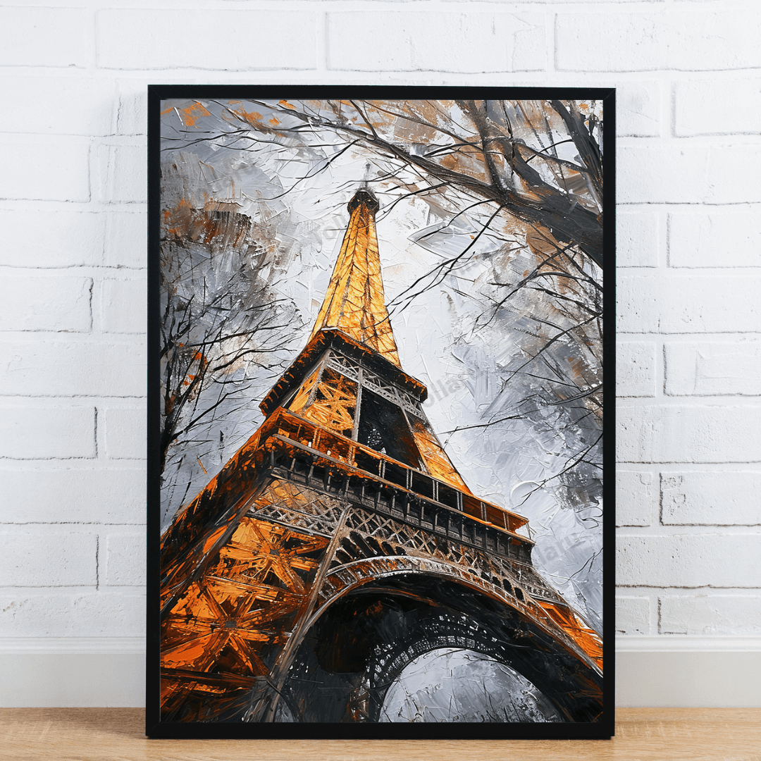 This elegant Eiffel Tower painting captures the charm and majesty of one of the world’s most iconic landmarks. With a dynamic upward perspective and bold brush strokes in golden and grey tones, it evokes the romantic essence of Paris. Ideal for modern or classic interiors, this wall art piece makes a statement in any setting—from home to office. Printed on premium canvas with a sleek black frame for a polished finish.