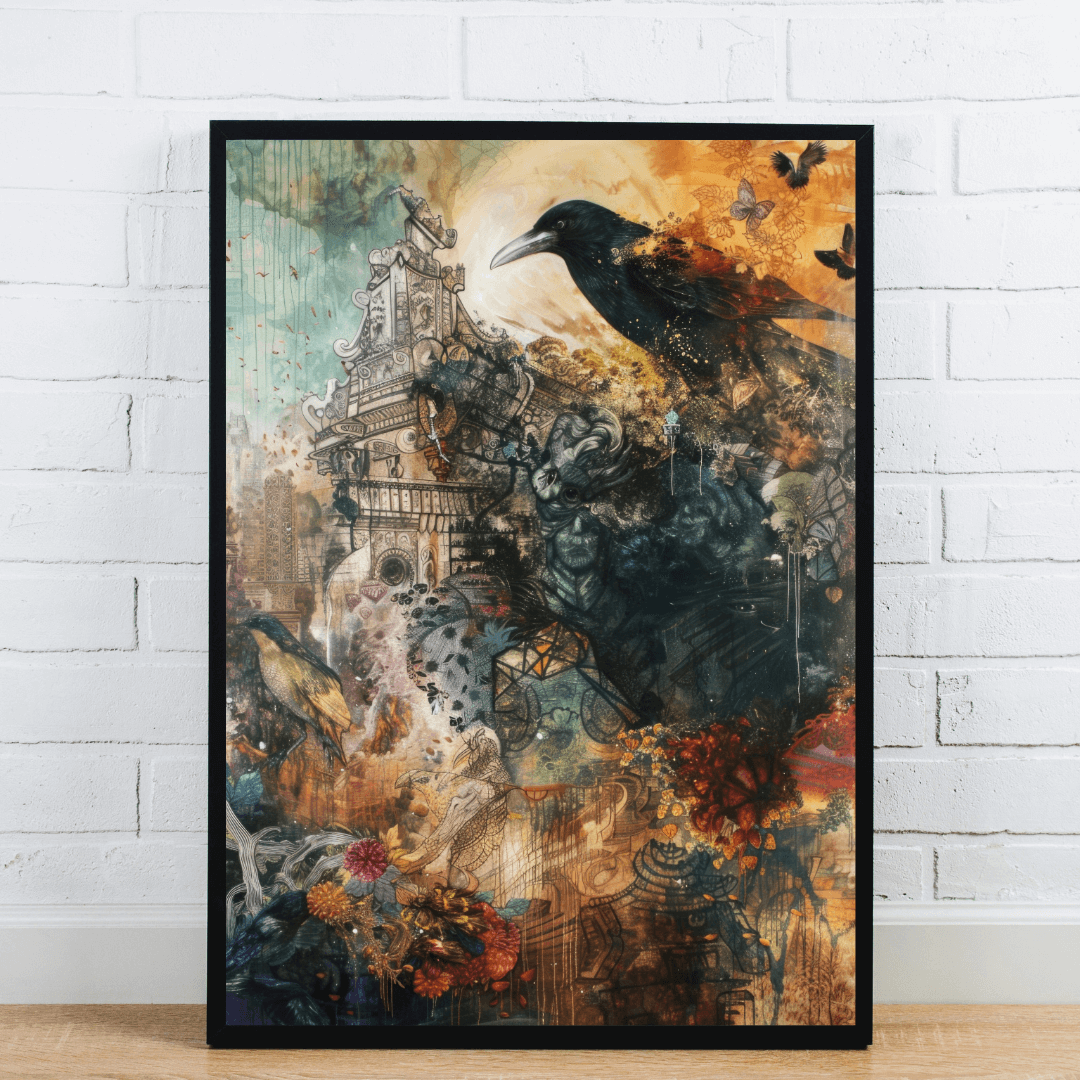 Gothic crow artwork featuring dark fantasy elements, detailed illustrations, and rich earthy tones. A dramatic wall art piece for unique interior décor.