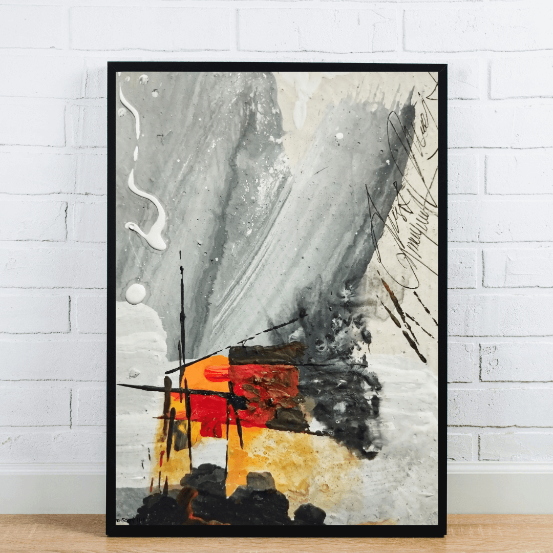 Immerse yourself in the raw beauty of abstract expressionism with this dynamic painting. Featuring fluid grey strokes contrasted by vivid orange, yellow, and deep black elements, the composition evokes emotion and energy. Splashes of white and hand-drawn script elements add a layered, artistic feel. This piece is perfect for art lovers seeking a bold yet refined focal point for their space.