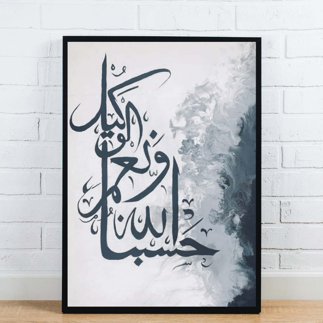 This elegant wall art features the Islamic phrase “Hasbunallahu Wa Ni’mal Wakeel” (Allah is Sufficient for us, and He is the Best Disposer of affairs) in graceful Arabic calligraphy. Set against a fluid marble-textured background in shades of white, grey, and black, this design blends faith and fine art seamlessly. Perfect for prayer rooms, entryways, or modern minimalist homes seeking a spiritual yet stylish focal point.
