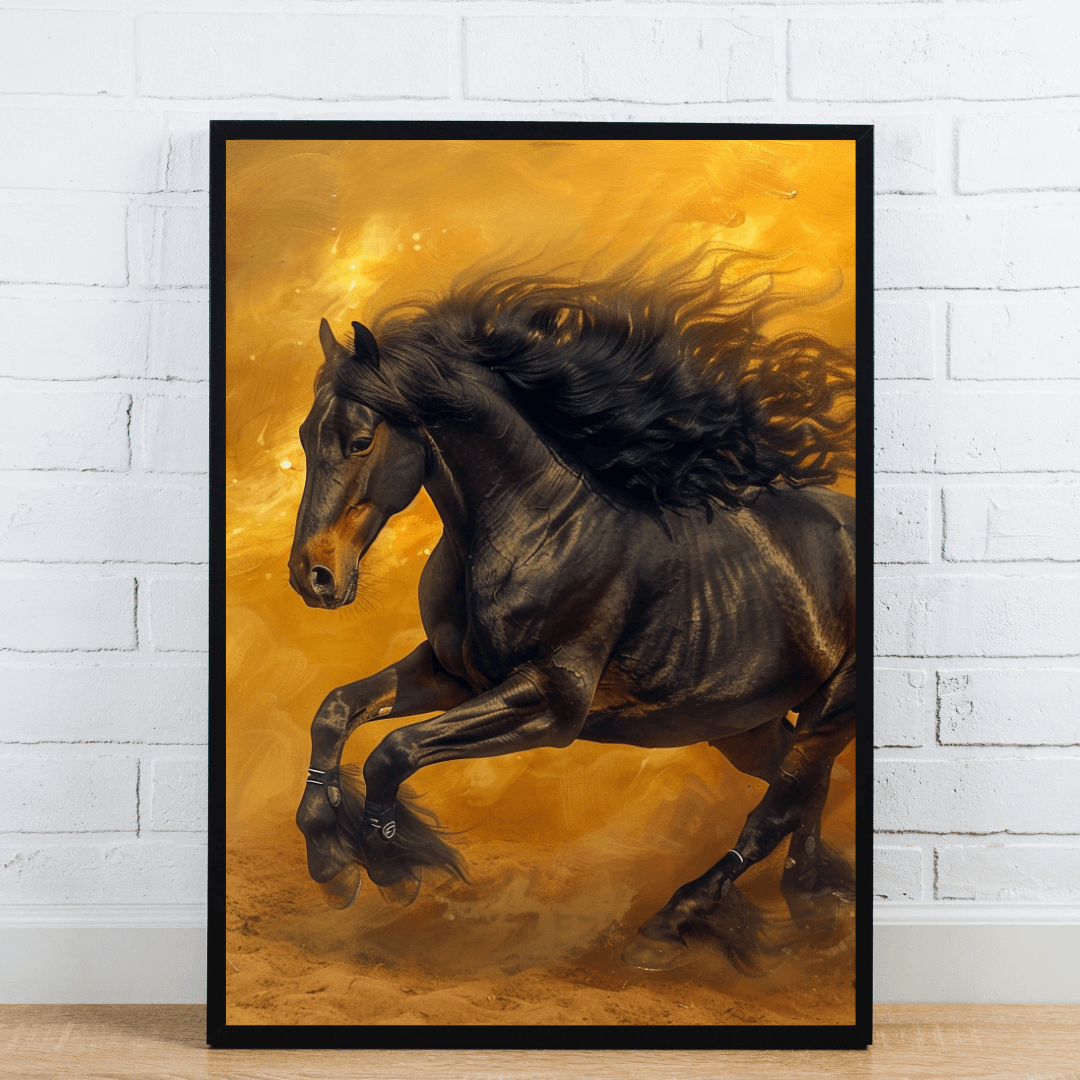 This captivating artwork showcases a majestic black horse in mid-gallop, set against a dynamic fiery orange background that evokes energy and motion. The horse’s flowing mane and muscular form are highlighted with fine details, creating a sense of strength and freedom. Perfect for lovers of equine art and bold, vibrant decor.