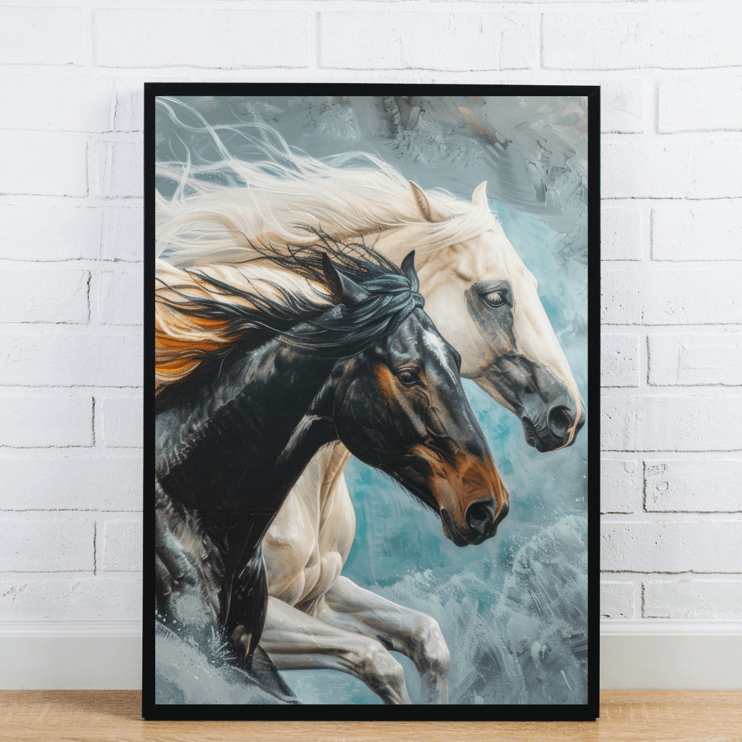 A stunning framed painting of two majestic horses, one black and one white, captured in dynamic motion with flowing manes. Perfect for adding an elegant and energetic touch to any room.