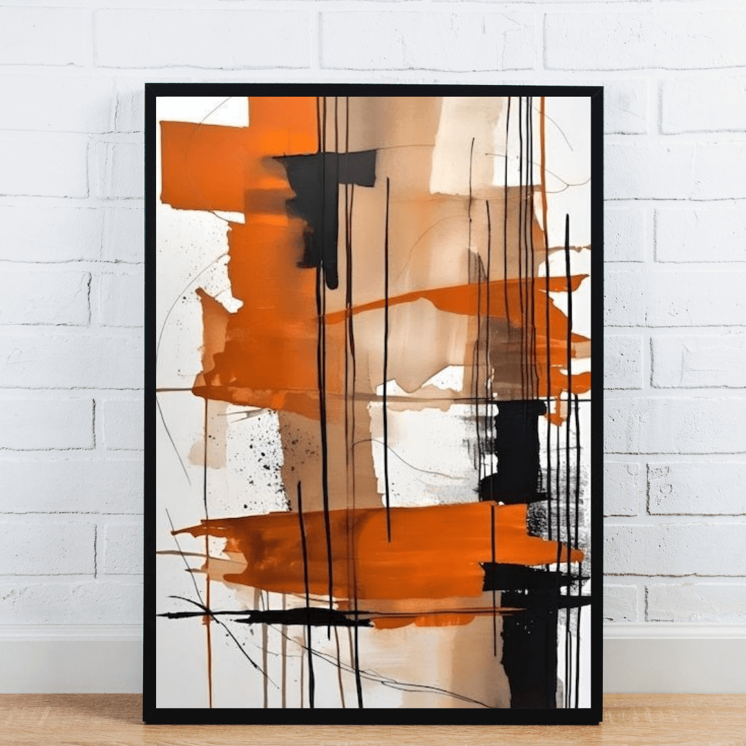 Elevate your interior with this modern abstract wall art showcasing dynamic orange brush strokes, structured black lines, and soft beige washes. This expressive artwork blends raw energy with refined composition, making it perfect for modern living rooms, lofts, and creative workspaces. Its minimalist yet bold design offers visual impact while maintaining a contemporary aesthetic, ideal for lovers of abstract expressionism.