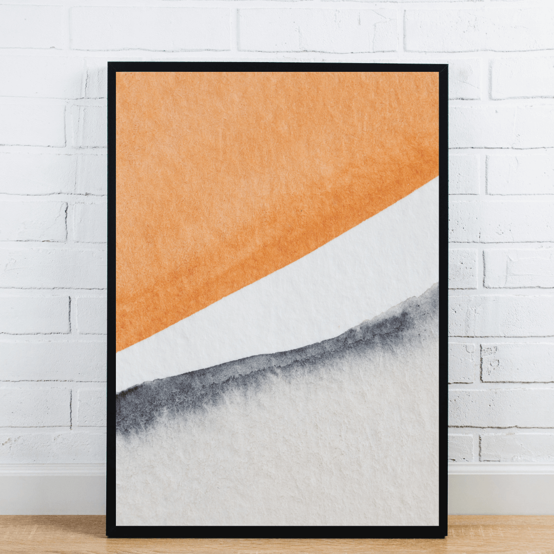 This modern abstract wall art print showcases a striking diagonal composition with a vivid orange upper section, a clean white center, and a soft transition into textured grey and off-white hues. Designed for contemporary or minimalist spaces, it adds a sophisticated pop of color and artistic flair to any room. Ideal for living rooms, offices, or creative studios.