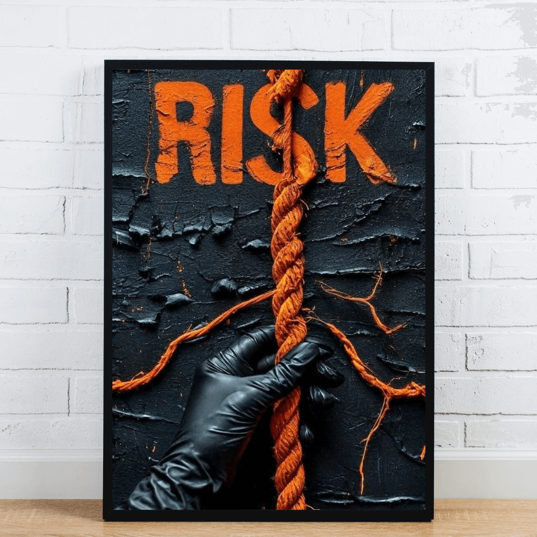 This powerful and visually intense wall art features the word “RISK” boldly painted in orange above a gloved hand tightly gripping a textured orange rope. Set against a cracked black background, the artwork evokes themes of strength, determination, and bold decision-making. Ideal for motivational spaces like offices, gyms, startups, or creative studios, this piece is a reminder that progress often requires taking risks.