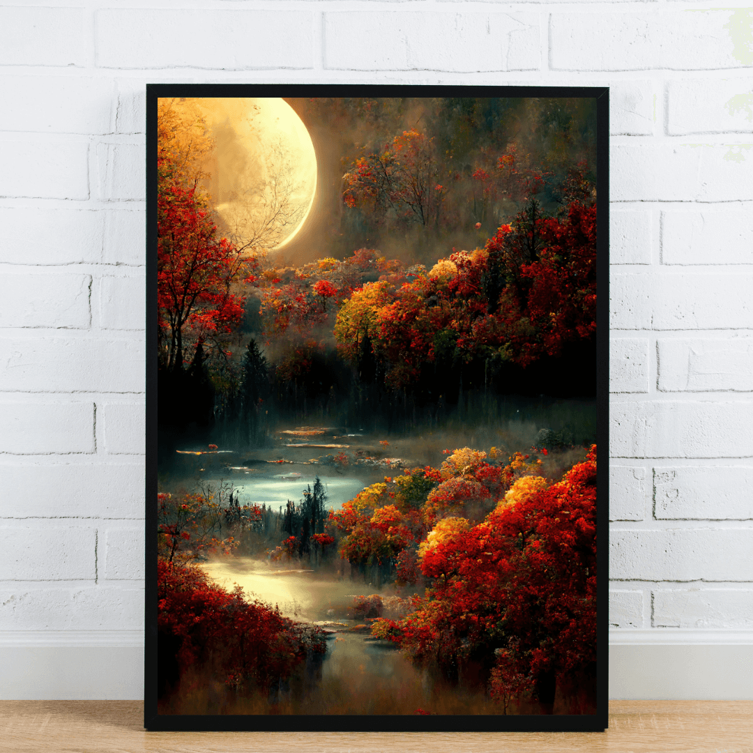 This enchanting wall art captures a surreal forest drenched in autumn hues, illuminated by a massive glowing moon hanging over a misty river. The vivid reds, oranges, and golds of the trees contrast beautifully with the soft moonlight and shadowy depths of the forest, creating a dreamlike, almost fantasy-inspired atmosphere. Ideal for living rooms, bedrooms, or creative spaces, this piece adds warmth, mystery, and depth to any setting. Printed with high-definition detail and framed for a gallery-ready look, it’s a stunning gift or statement piece for nature and fantasy art lovers.