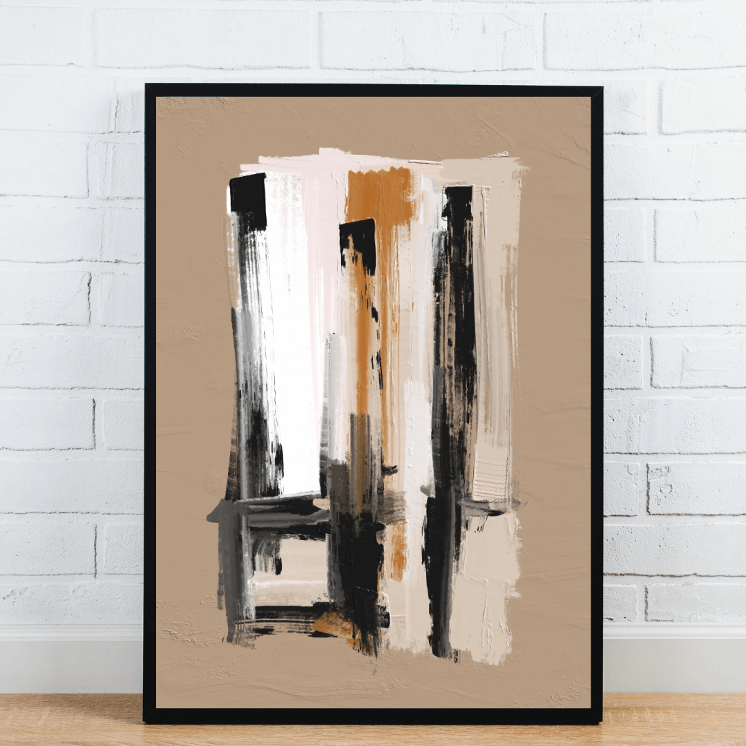 Elevate your wall decor with this modern neutral-toned abstract art. Featuring powerful vertical brush strokes in a monochrome palette of black, beige, white, and warm caramel, this piece brings a striking sense of motion and energy. Ideal for contemporary spaces, offices, or minimalist homes, this artwork offers depth, contrast, and visual interest while maintaining a clean and sophisticated color scheme. Professionally framed and printed on high-quality canvas.