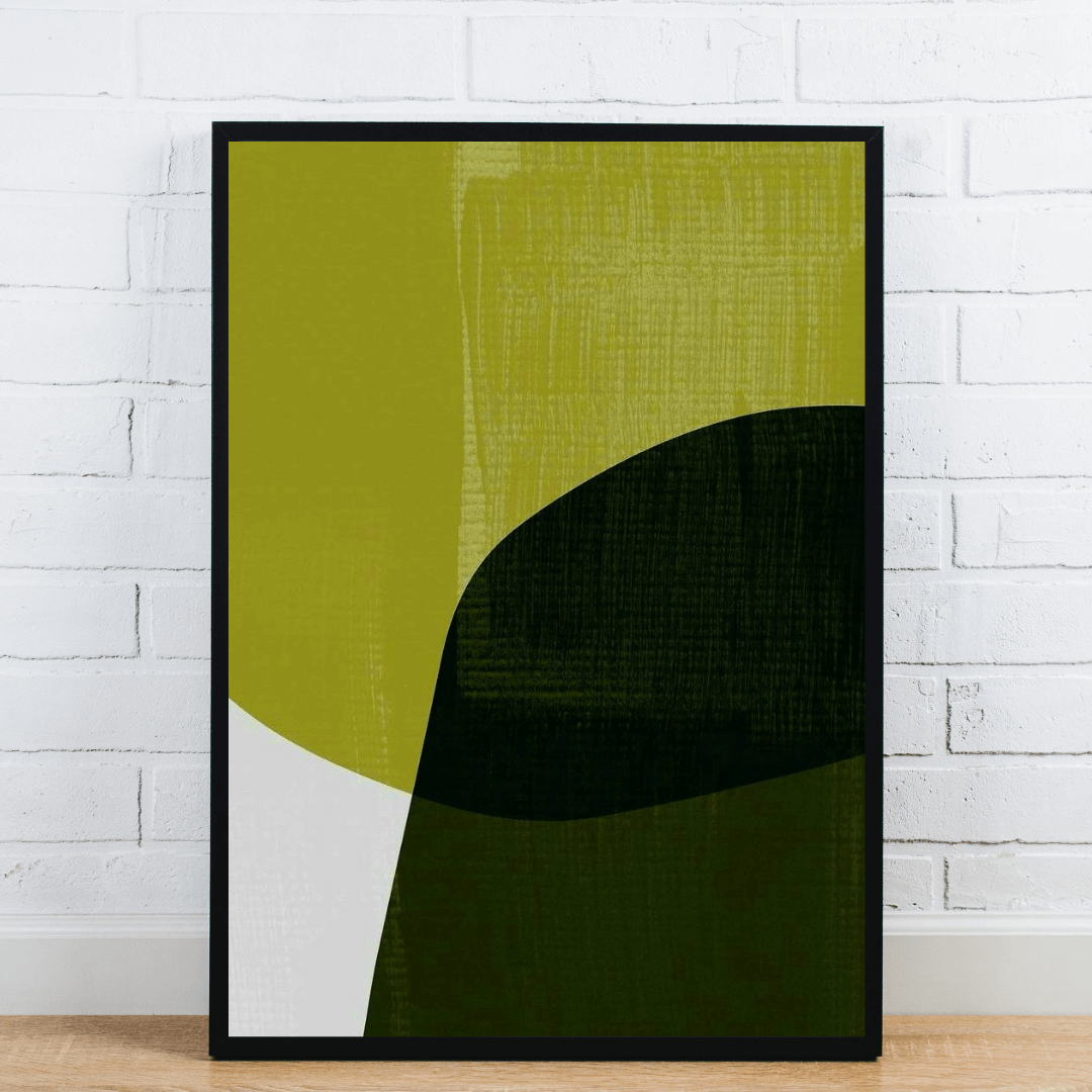 This modern abstract wall art poster presents a calming and sophisticated composition of overlapping olive green, forest green, and off-white shapes. The soft curves and subtle texture create visual interest while maintaining a minimalist aesthetic. Perfect for contemporary, Scandinavian, or nature-inspired decor, this artwork adds a grounded, organic feel to any room. Displayed in a sleek black frame against a white brick wall, it becomes an elegant centerpiece.