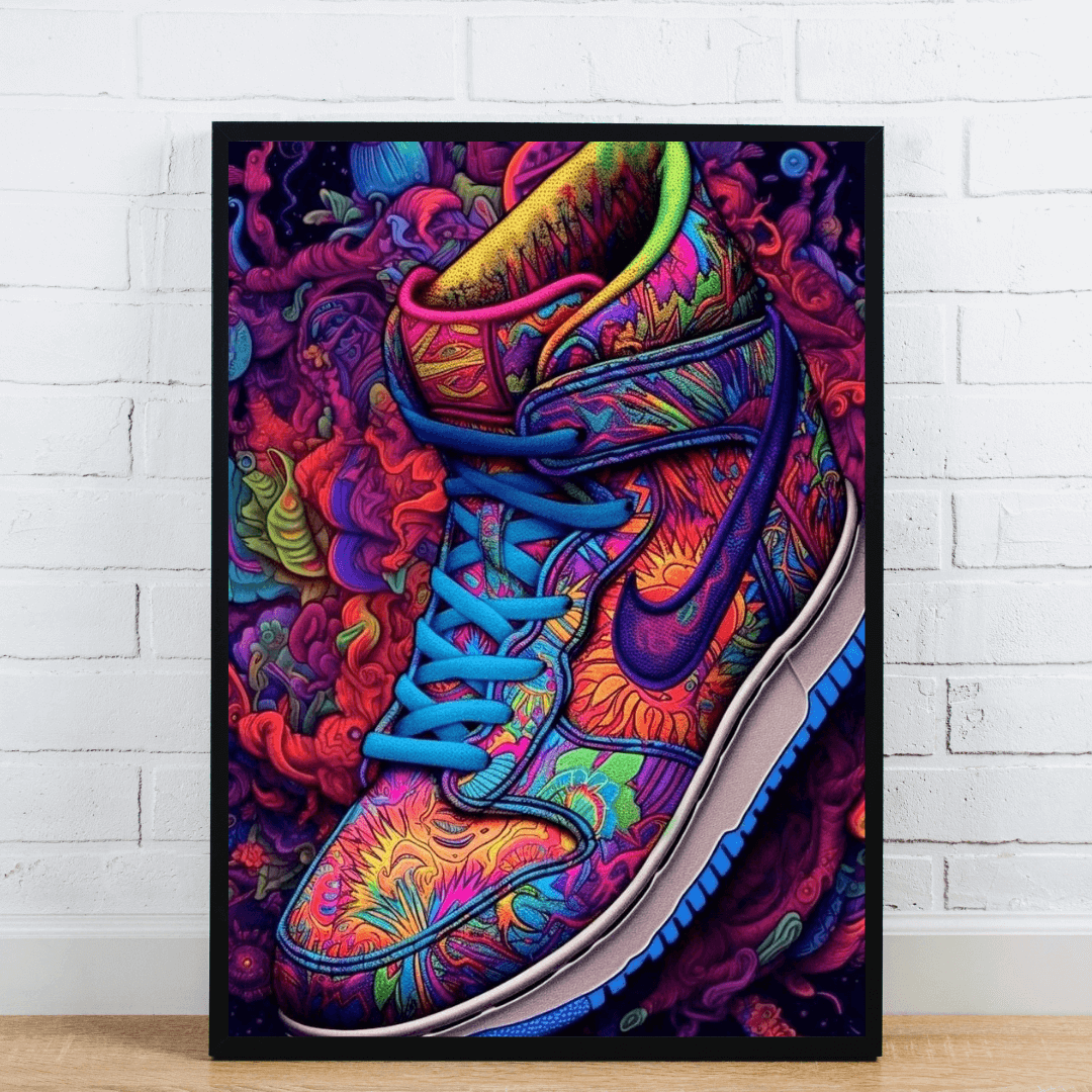 Step into a world of bold color and street style with this psychedelic sneaker art print, inspired by Nike designs. Bursting with intricate patterns, swirling textures, and vivid neon hues, this artwork captures the spirit of urban fashion and creativity. Perfect for sneakerheads, modern art collectors, or anyone looking to elevate their space with a high-energy statement piece.