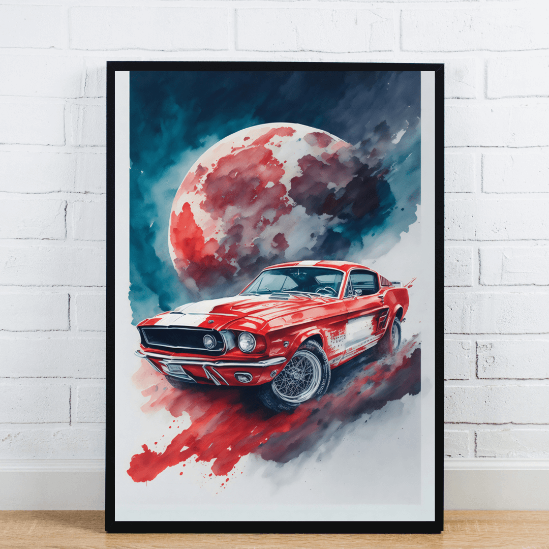 Make a bold statement with this dynamic wall art featuring a classic red muscle car set against a dramatic moonlit sky. Perfect for car lovers, collectors, or anyone who appreciates vintage automotive design with an artistic twist. The vibrant red tones and surreal background create a powerful visual impact, ideal for garages, man caves, or modern interiors.