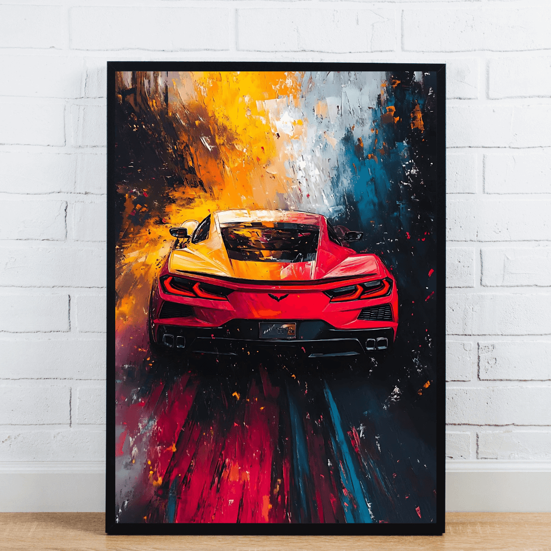 This high-energy artwork captures the rear view of a sleek red sports car speeding through an explosion of vivid colors. The abstract background features powerful streaks of yellow, red, blue, and white, creating a dynamic sense of movement and intensity. Perfect for car enthusiasts or modern art lovers, this wall art adds speed, passion, and adrenaline to any living space, office, or garage setting.