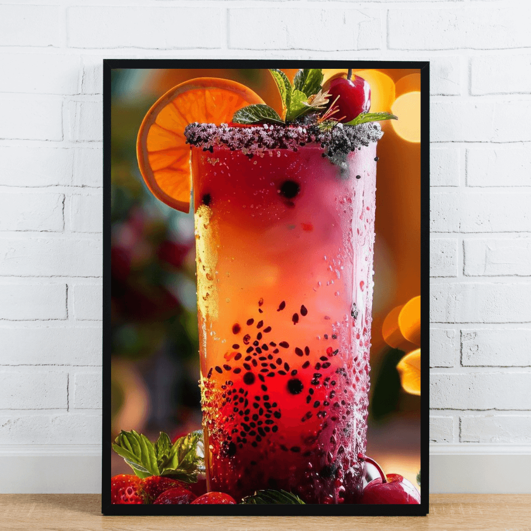 Add a splash of flavor to your space with this vivid poster showcasing a refreshing fruit drink layered with vibrant colors, basil seeds, and garnished with orange, mint, and cherries. This eye-catching artwork is ideal for cafes, juice bars, kitchens, or anyone who appreciates the art of beverages. The condensation on the glass and the glowing background give a fresh, chilled vibe that invites relaxation and indulgence.