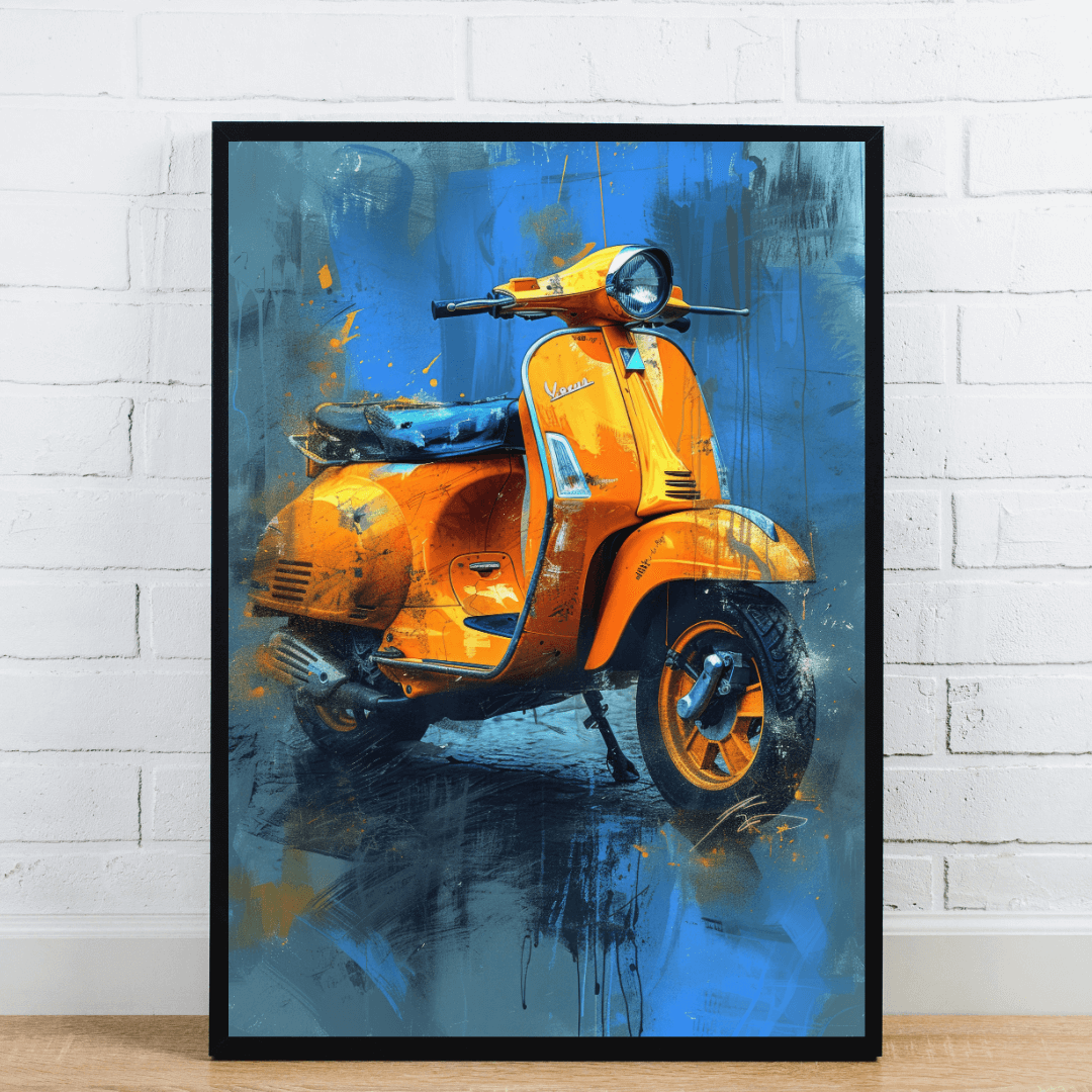 Infuse your space with energy and style using this bold retro Vespa scooter art. The vivid orange of the classic scooter pops against a deep, grungy blue background with splashes and texture that give it a gritty, urban vibe. This artwork is ideal for lovers of vintage transportation, industrial design, or anyone looking to make a powerful visual statement on their wall. A great fit for lounges, creative studios, cafes, or modern apartments.