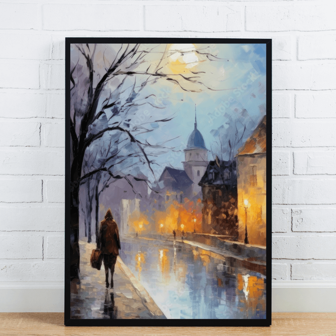 Bring warmth and emotion to your walls with this romantic city street canvas art. The painting depicts a solitary figure strolling along a rain-soaked path lined with glowing street lamps and classic architecture. Soft reflections in the wet pavement, paired with warm golden lights and cool blue tones, create a beautifully balanced composition. Perfect for cozy living rooms, reading nooks, or stylish hallways, this piece evokes both nostalgia and serenity.