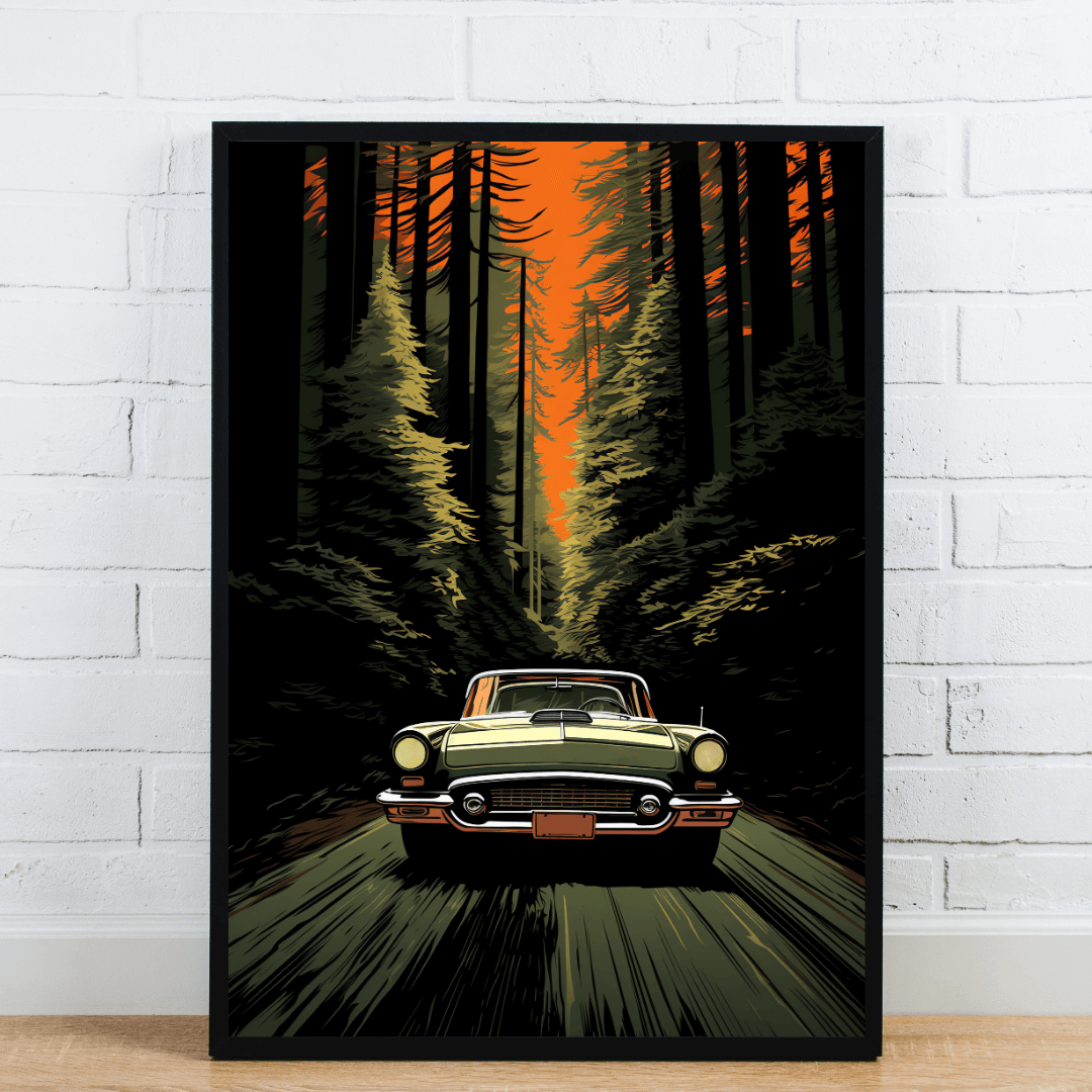 This striking artwork features a classic vintage car cruising through a dense forest road at sunset. The tall trees cast deep shadows while the sky glows with vivid orange hues, creating a dramatic contrast that highlights the car’s sleek design. Perfect for car enthusiasts and nature lovers alike, this poster blends retro automotive style with natural beauty.