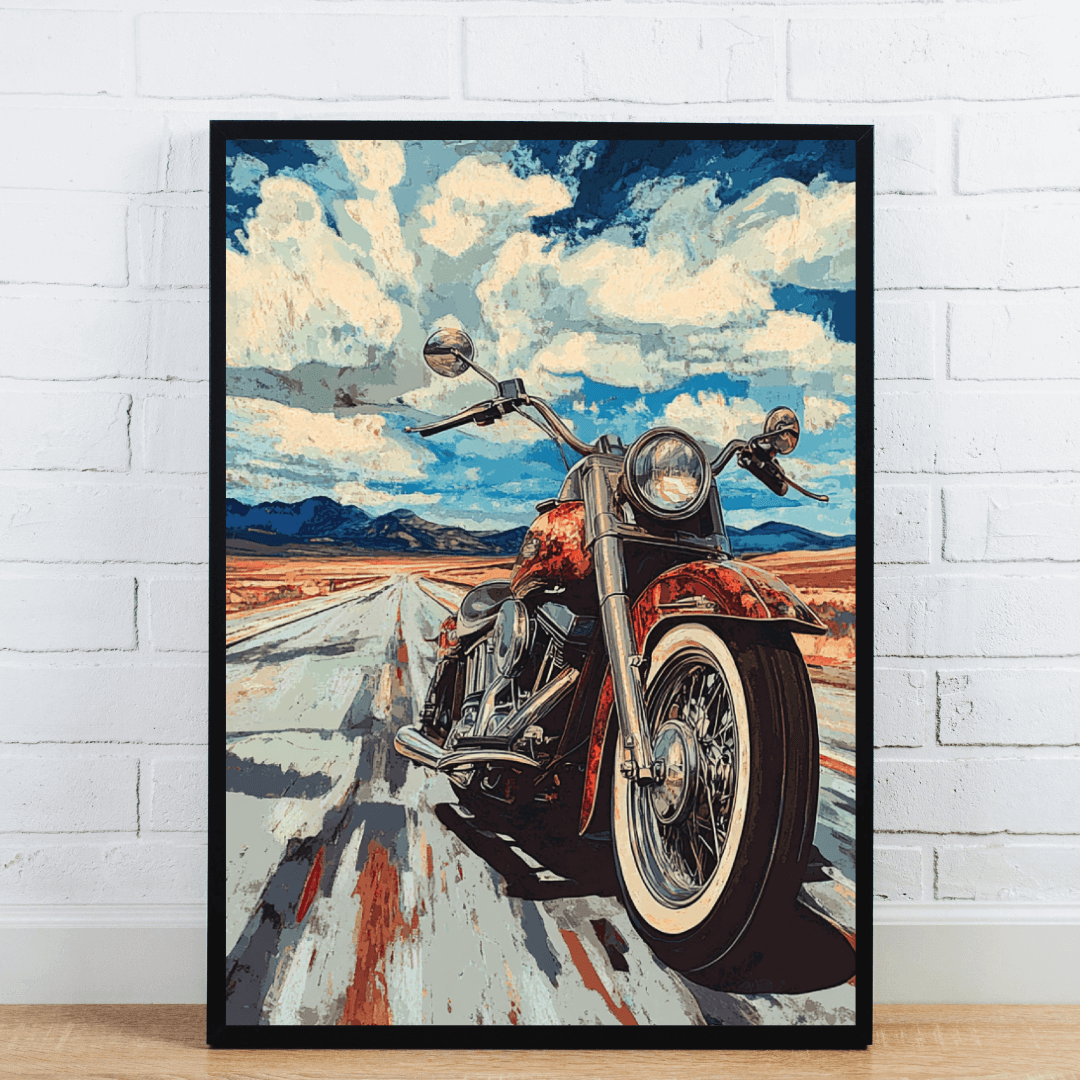 This eye-catching wall art features a powerful vintage motorcycle cruising down an endless desert highway beneath a sky filled with textured clouds. With its bold colors and retro artistic style, this piece captures the thrill of freedom and the open road. Ideal for motorcycle lovers, man caves, garages, or industrial-themed interiors, this print adds a rebellious yet nostalgic vibe to any setting. Printed on premium material and professionally framed, it’s ready to inspire adventure wherever it’s hung.