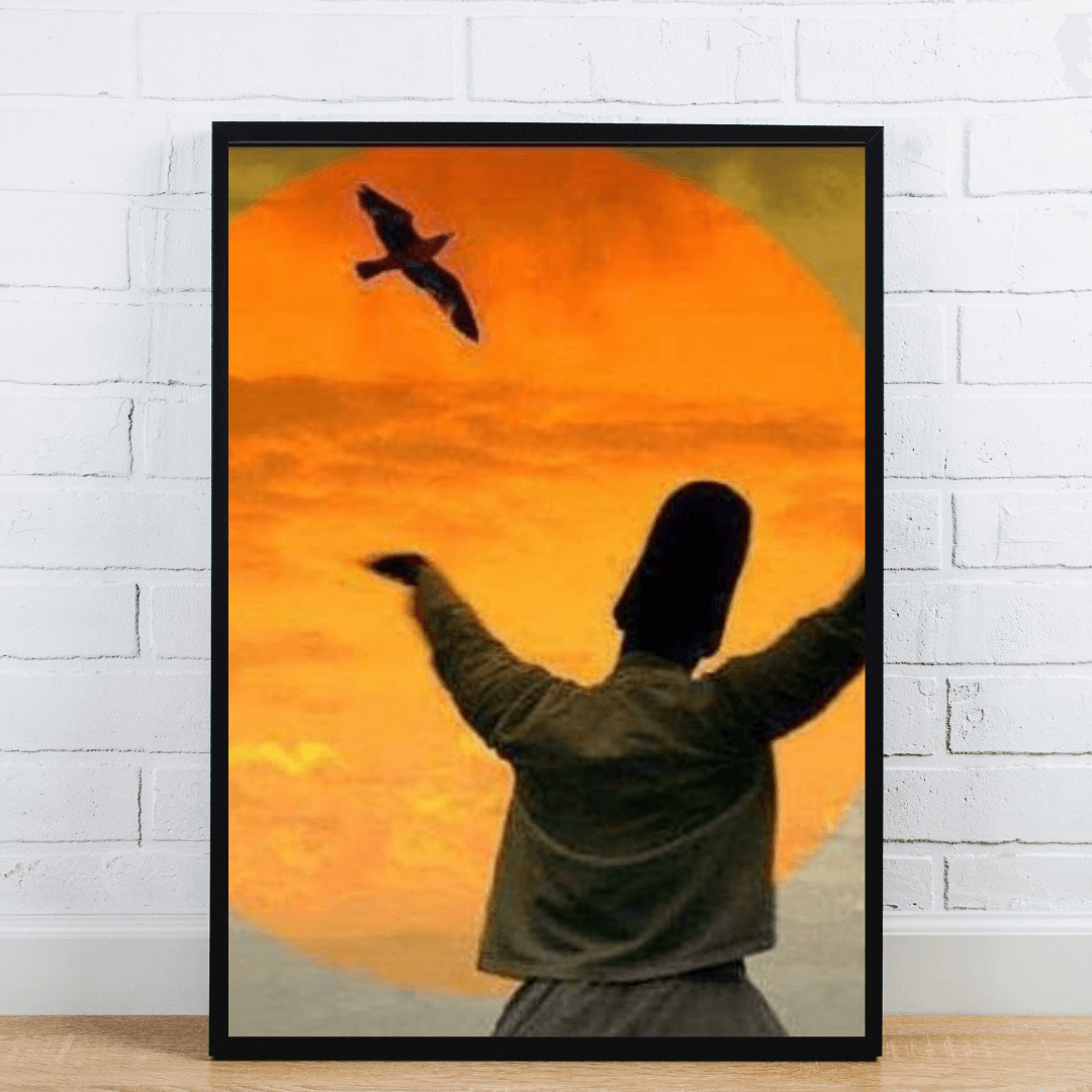 A silhouette of a whirling dervish dancing with arms outstretched, set against a vivid orange sunset and a soaring bird.