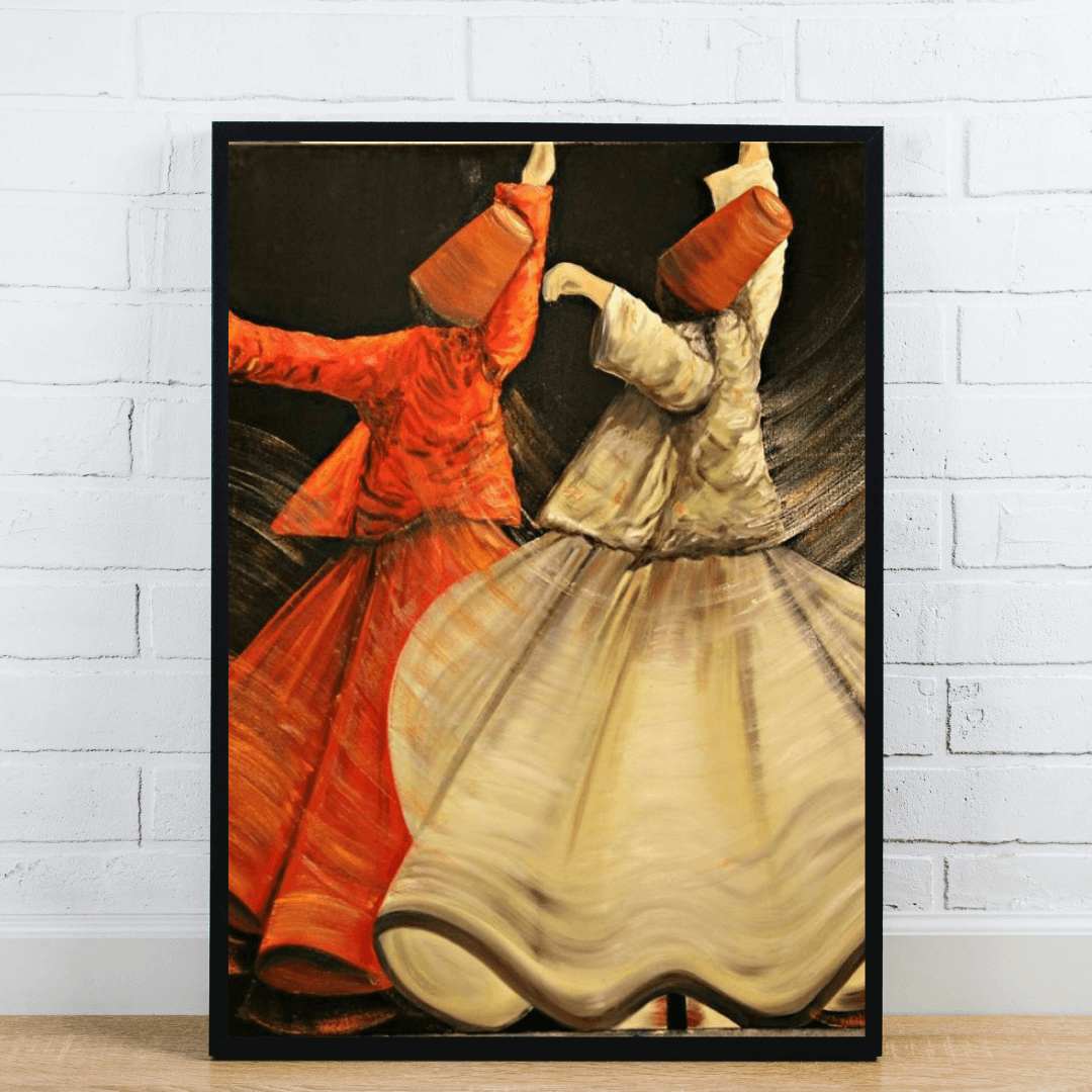 Immerse yourself in the mystic rhythm of Sufism with this beautifully rendered art print of two whirling dervishes in motion. One figure is dressed in red and the other in beige, symbolizing spiritual harmony and balance. Their traditional attire, with flowing skirts and iconic tall hats, evokes the sacred ritual of the Sema dance — a form of physical meditation practiced by Sufi dervishes to reach divine love and unity. The background’s dark, textured swirls enhance the motion and energy of the figures, making this piece both visually and emotionally engaging. Whether you’re decorating your home, office, or a spiritual retreat, this artwork brings a sense of peace, transcendence, and cultural richness.