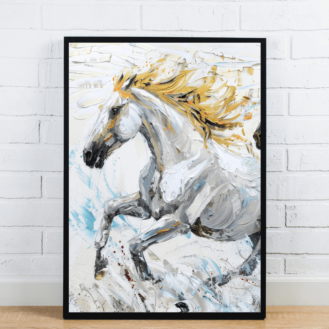 Capture the spirit of freedom with this vibrant abstract wall art featuring a powerful white horse in mid-gallop. Painted with bold, expressive strokes in white, gray, and blue tones, the composition is brought to life by a striking golden mane and splashes of movement. The textured background and modern palette make this piece a standout in any space, ideal for equestrian enthusiasts and lovers of dynamic, modern art.